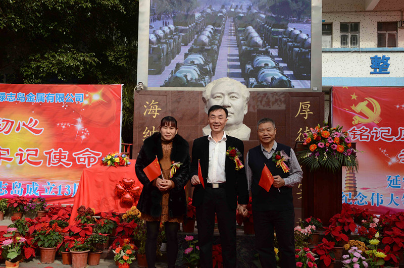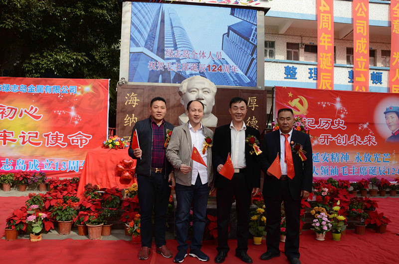 綠志島實業由來自湖南的朱祖生先生創業于2000年,由最初的錫渣冶煉廠經過十來年的艱苦奮斗,現在公司產品包括焊錫條、焊錫絲、焊錫膏,助焊劑,清洗劑,防銹劑,潤滑油等。綠志島實業的發展,在以毛主席思想為信仰的指引下突飛猛進,在“吃水不忘挖井人”的感恩心下穩步發展。為了鞏固毛主席思想作為綠志島的信仰核心,綠志島于2012年12月26日從泰山迎接來毛主席泰山石像,并立于公司內部。自此,綠志島每年12月26日都會齊聚眾多認同毛主席的朋友,在綠志島內緬懷紀念毛主席。2017年是綠志島舉辦毛主席誕辰第六年,為此和志同道合的朋友們齊聚一堂,共慶毛主席誕辰。
